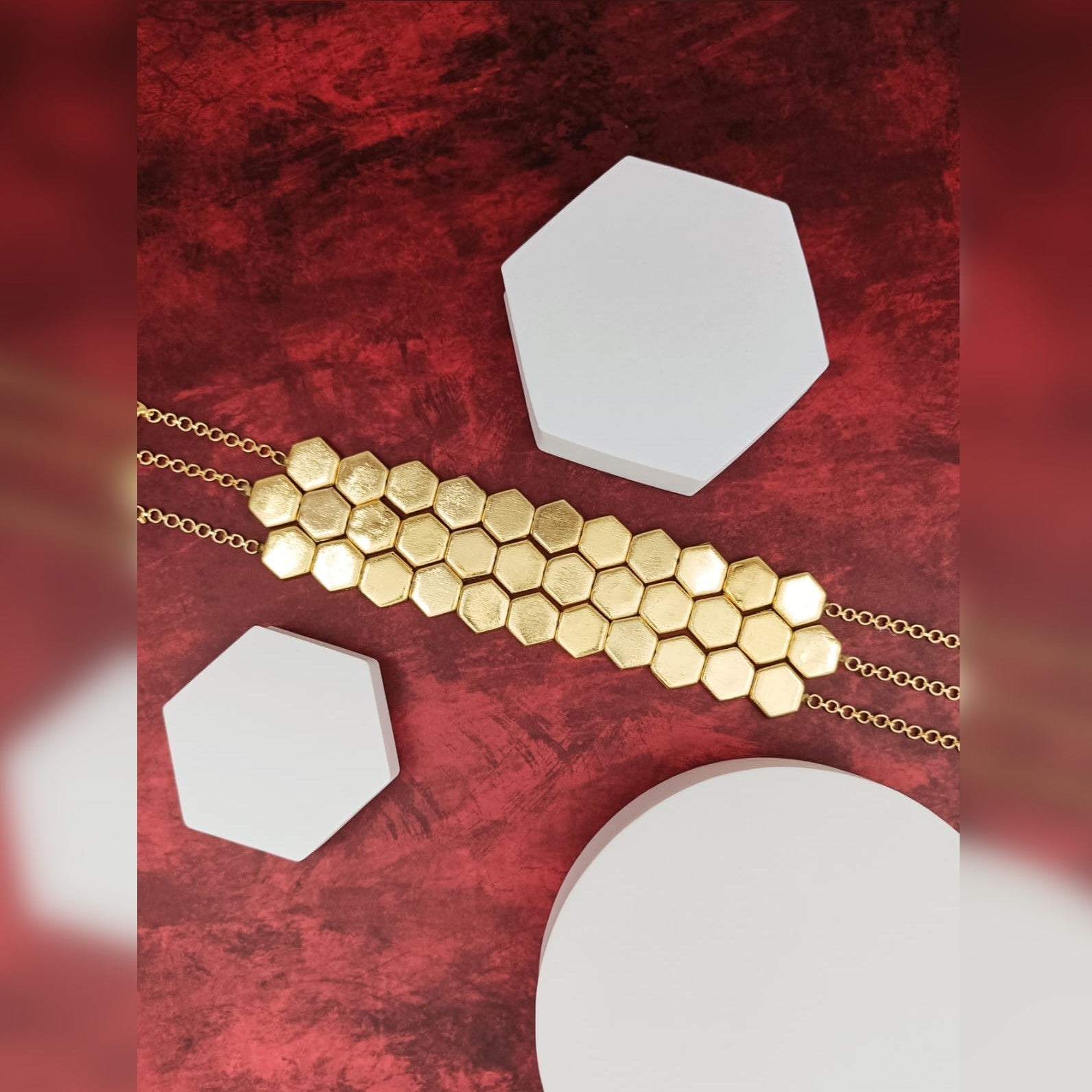 Defy conventional neckwear with our Hexagon Bold Choker – a rebellious geometric statement that sits provocatively at your throat. Three audacious chains interlock in a honeycomb formation, their hexagonal elements challenging the predictable curves of traditional jewelry. This isn't just an accessory; it's architectural warfare against the mundane, transforming your neckline into a battlefield of bold angles and metallic attitude. Wear it to slice through social expectations and establish your presence as someone who refuses to play by fashion's safe rules.