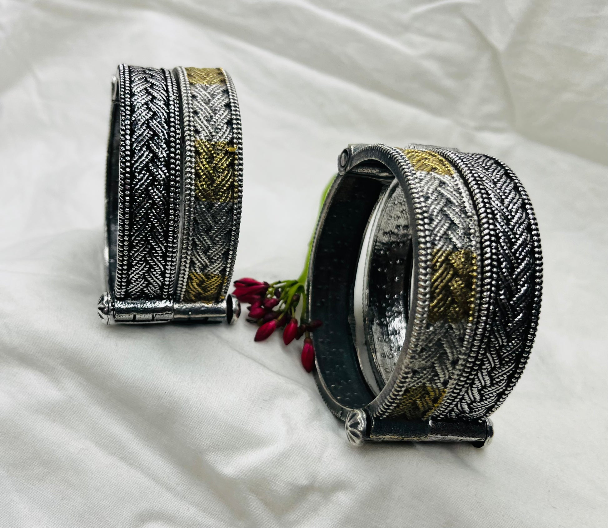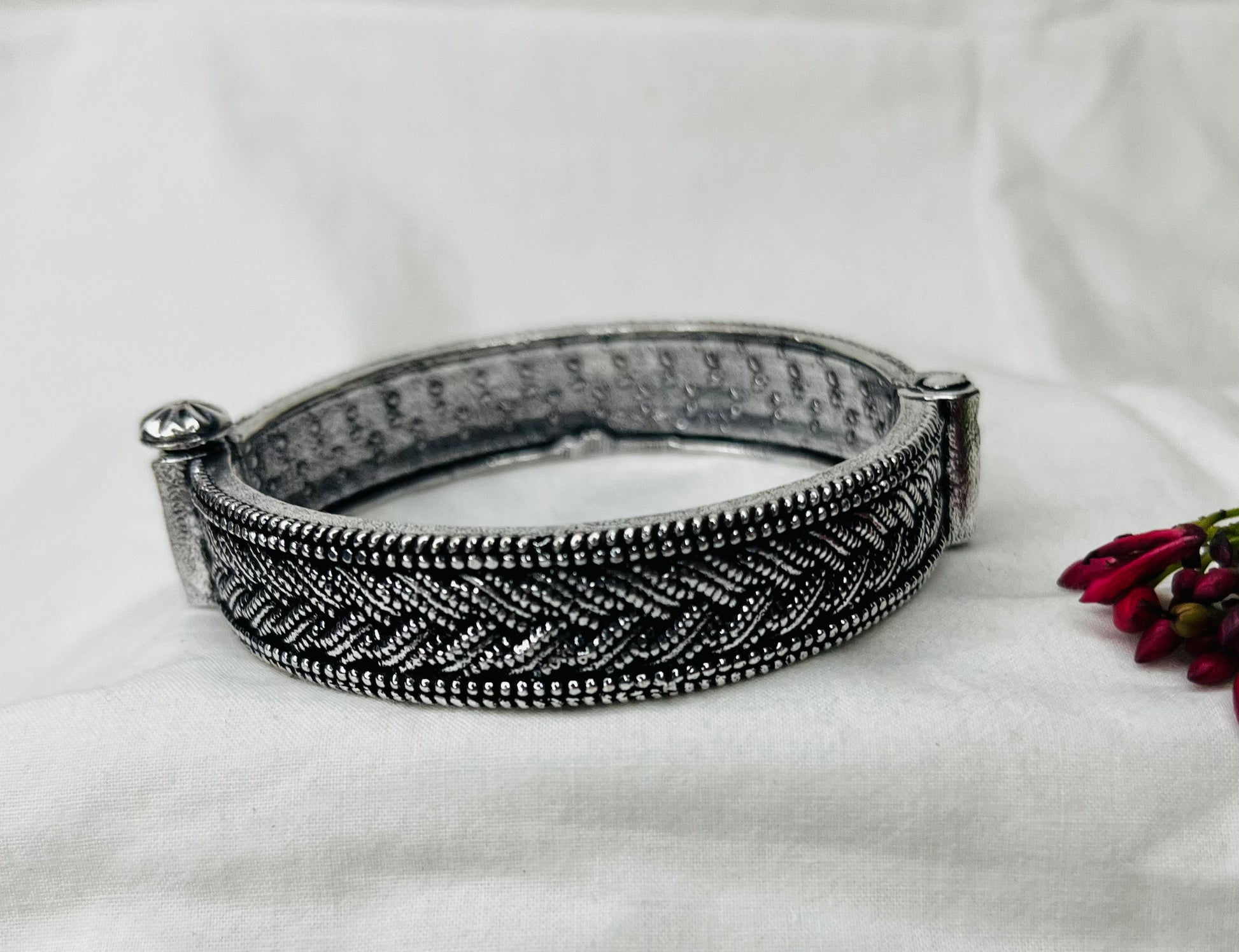 Level up your bangle game with this dazzling Entangled Oxidized Designer Kada. Perfect for special occasions or just that upgrade to your everyday look, these bangles are premium quality and make an elegant, fashionable statement. These kadas are free size and suitable for both 2.4 bangle size. Best of all, they'll add that extra sparkle to any ensemble, modern or traditional. Mom will love them, too! Get your bling on today!