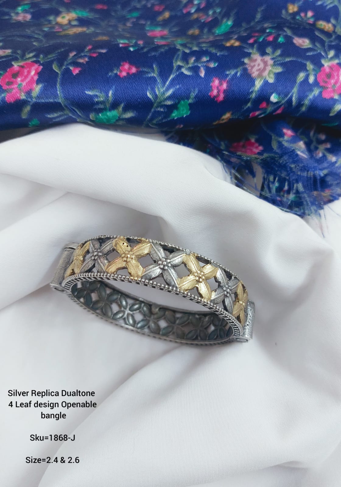 Level up your bangle game with this dazzling Silver Replica Dual Tone Designer Kada. Perfect for special occasions or just that upgrade to your everyday look, these bangles are premium quality and make an elegant, fashionable statement. These kadas are free size and suitable for both 2.4 and 2.6 bangle size. Best of all, they'll add that extra sparkle to any ensemble, modern or traditional. Mom will love them, too! Get your bling on today!