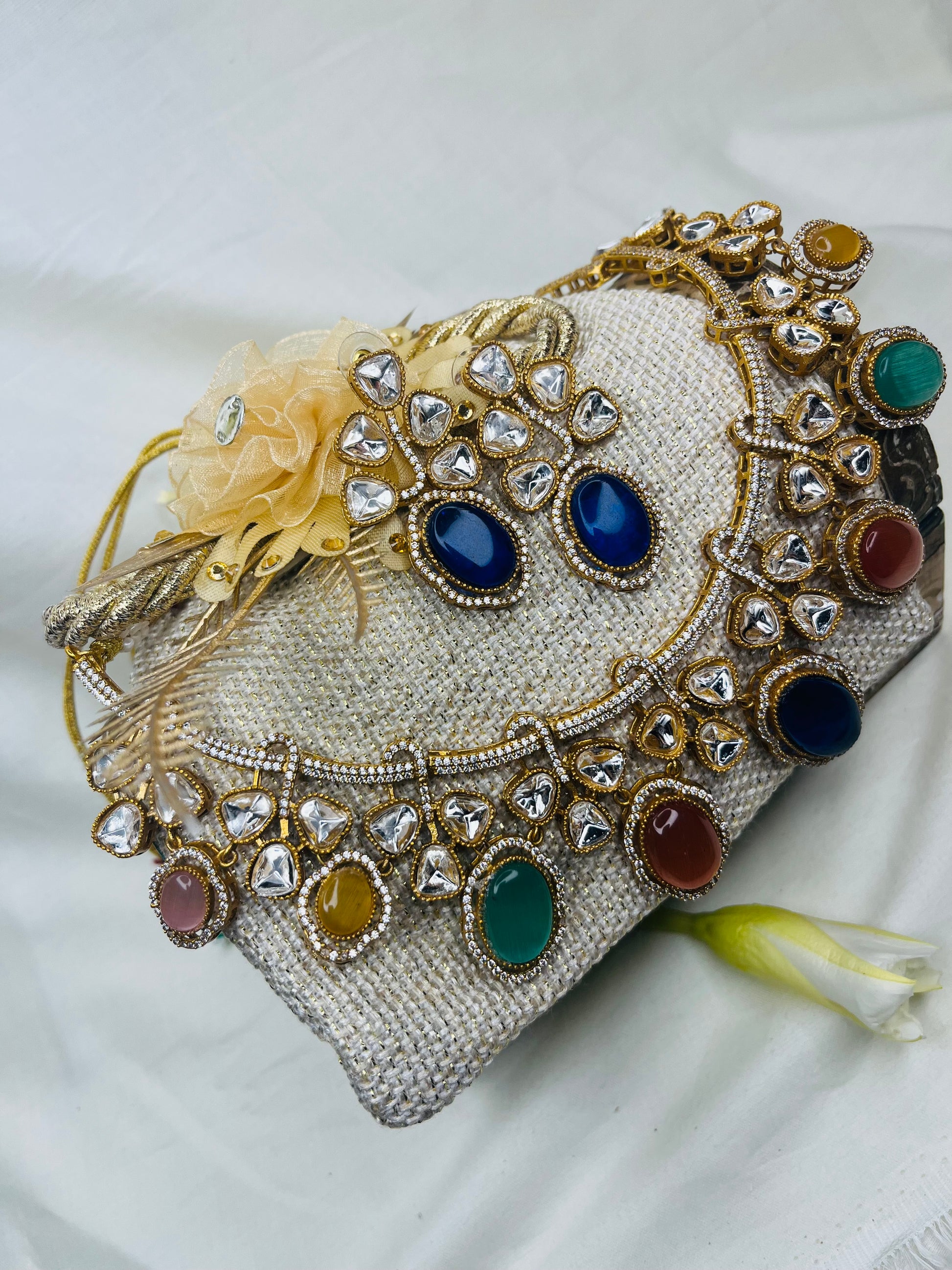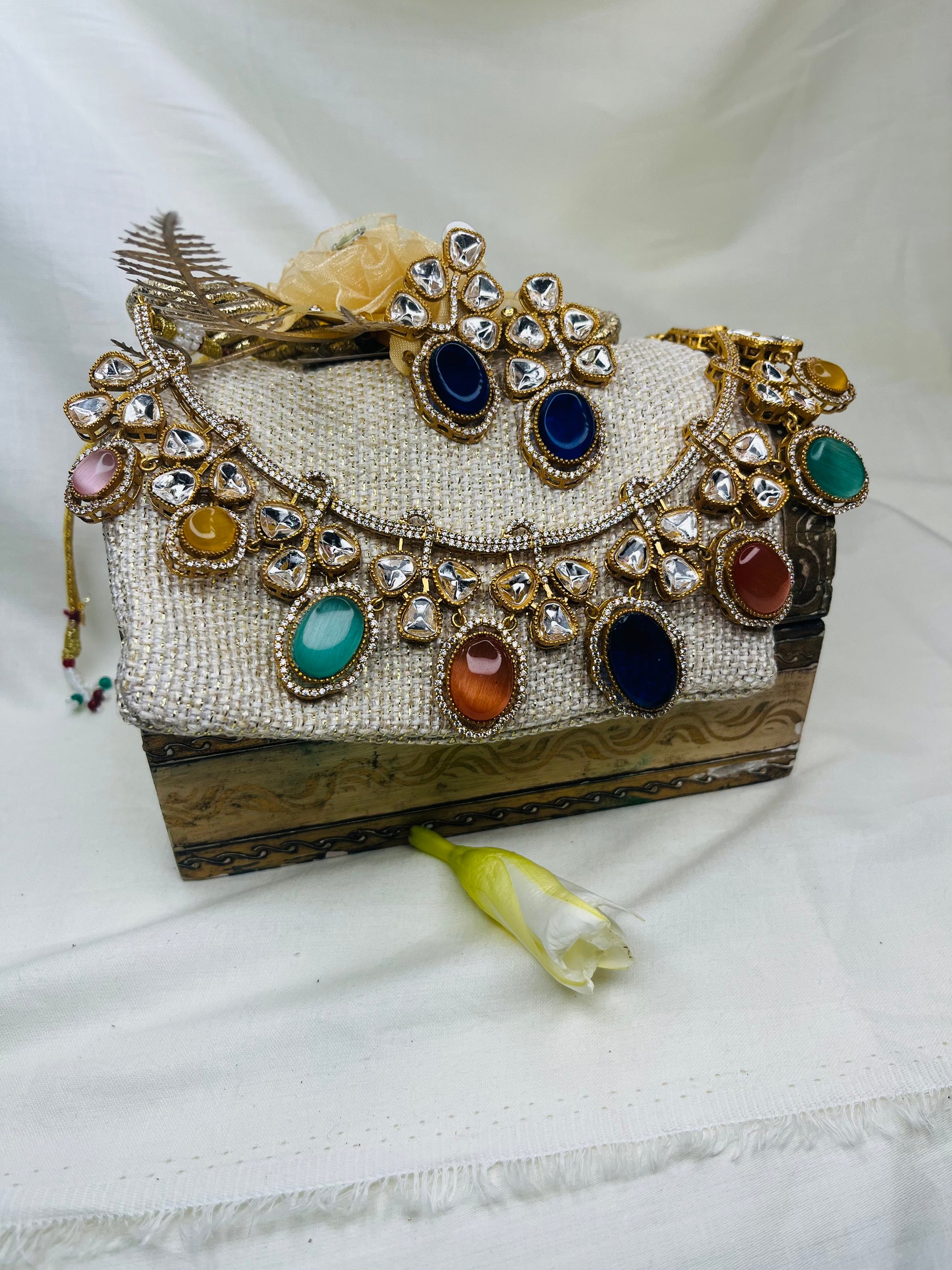 Elevate your aesthetic with our premium Multicolor Choker Set, showcasing expert craftsmanship through precisely arranged kundan work and carefully selected premium quality gemstones. This sophisticated accessory demonstrates the technical mastery of combining traditional artisanal techniques with contemporary design principles, creating versatile functionality across ethnic attire and western formal wear. Available in multiple colorways, this precision-crafted piece exhibits superior material quality and meticulous attention to structural detail—a technically superior addition to any curated jewelry collection and strategically appropriate for significant social engagements.
