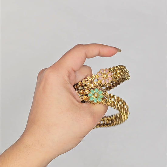 Level up your bangle game with these dazzling Daisy flower design kadas. Perfect for special occasions or just that upgrade to your everyday look, these bangles are premium quality and make an elegant, fashionable statement. Best of all, they'll add that extra sparkle to any ensemble, modern or traditional. Mom will love them, too! Get your bling on today!