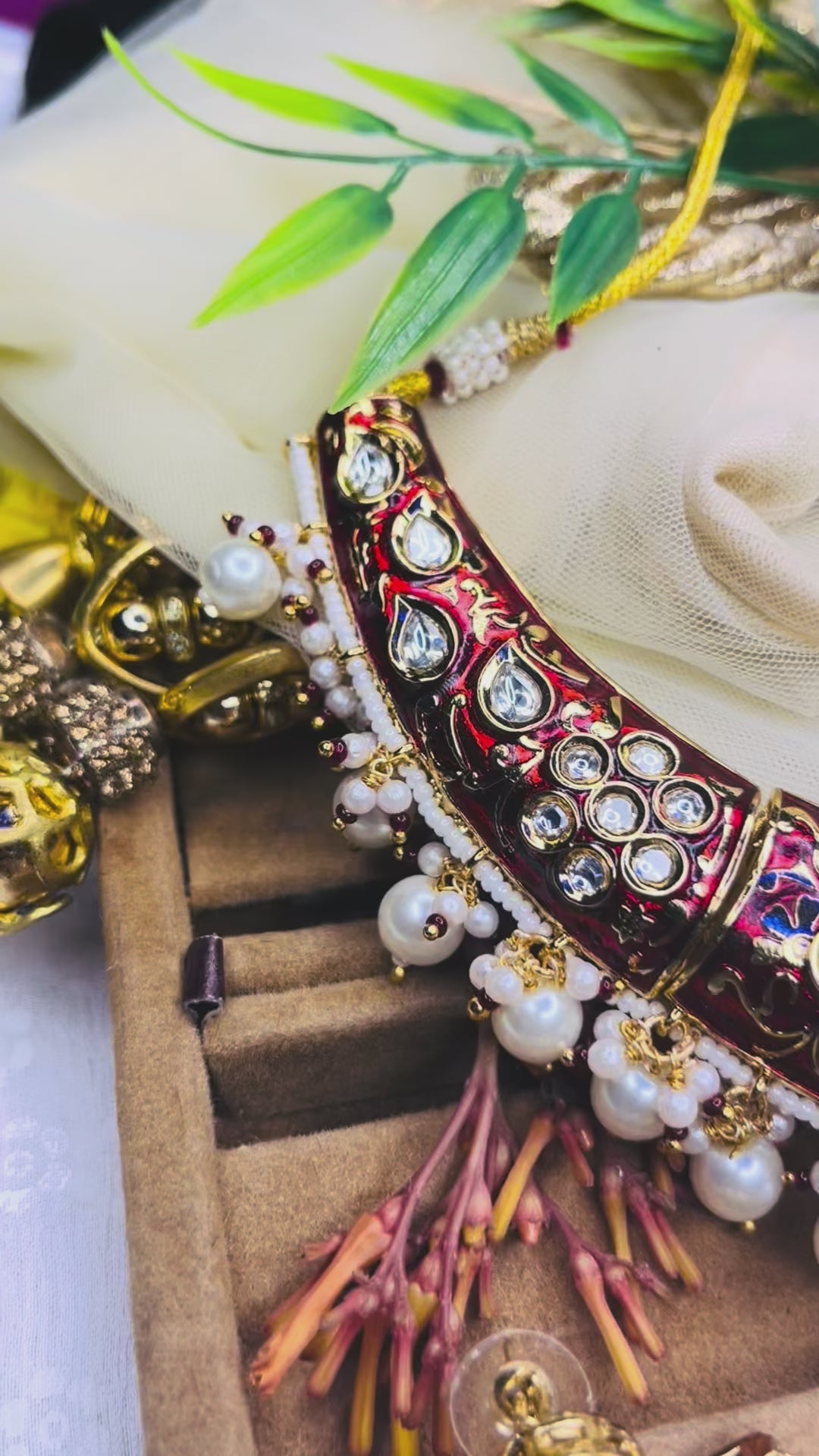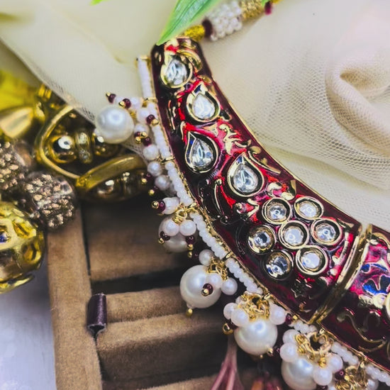 Dazzle and delight with our Polki Kundan Set! This playful yet elegant treasure features a stunning jadau golden pendant adorned with sparkling kundan stones and pristine white polki beads. The beautiful color combination creates a head-turning statement piece that's perfect for adding a touch of traditional glamour to any outfit. Be the belle of the ball with this must-have accessory!ing with ethnic dresses and sarees, this set will add a pop of color and style to any outfit.