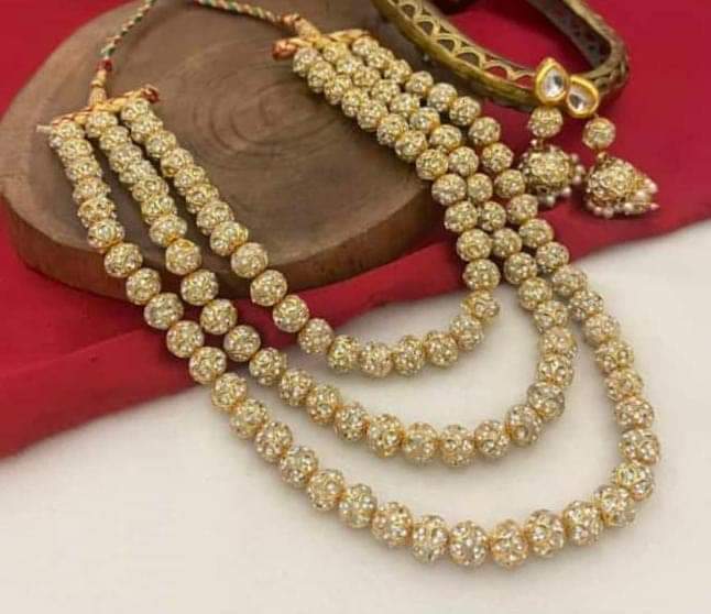 The Motif Triple Layer Mala set is a must-have for any fashionista looking for a touch of elegance. This exquisite necklace set features golden and white kundan stone balls, white polki beads, creating a beautiful mix of colors. Perfect for pairing with ethnic dresses and sarees, this set will add a pop of color and style to any outfit.