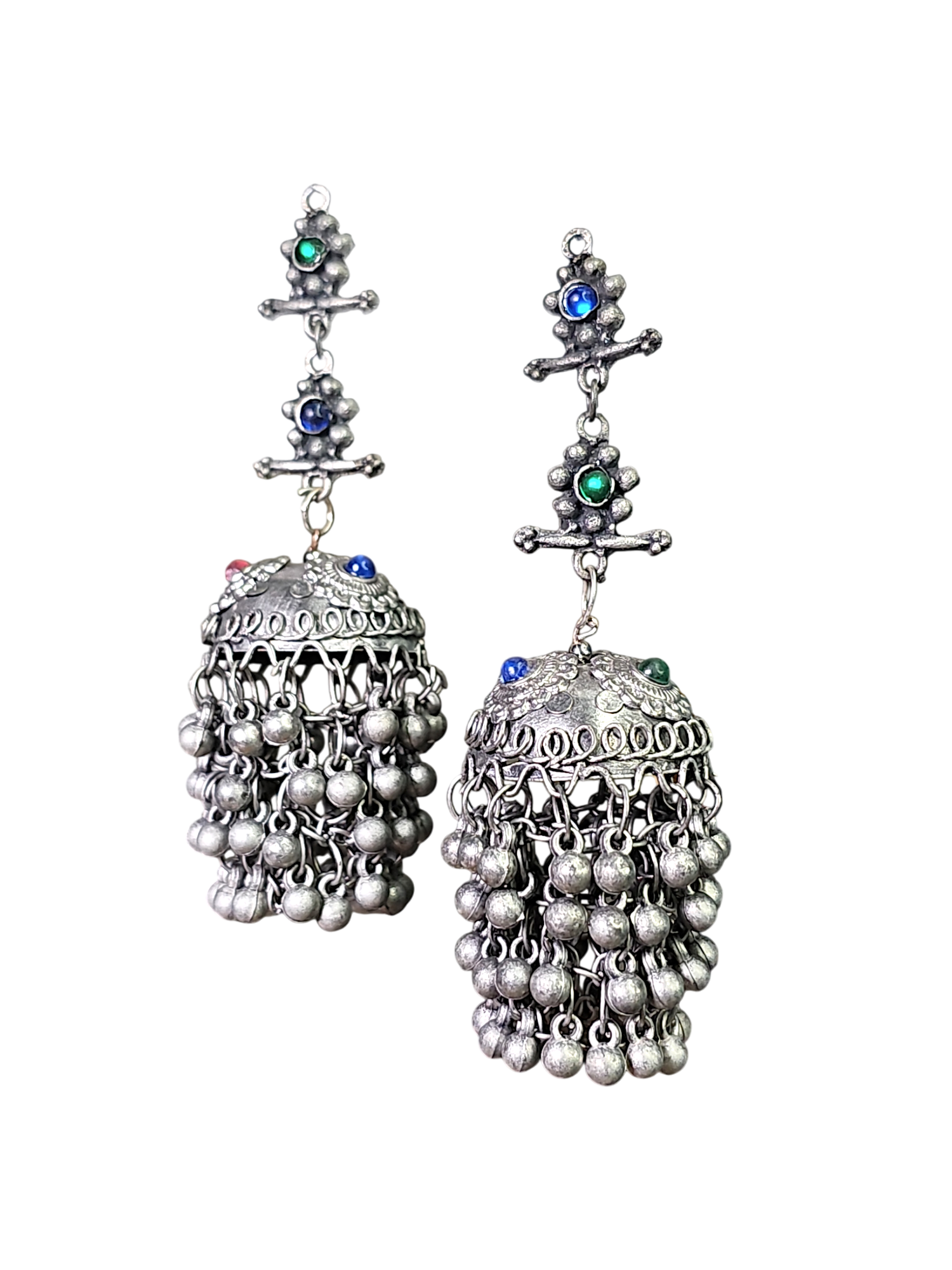 Oxidized silver multicolor long jhumkas.