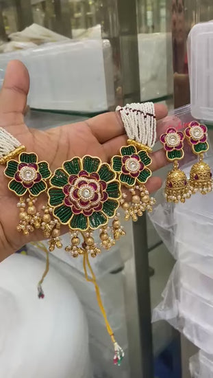 Elevate your look with our stunning Meenakari Choker Set, featuring top-quality kundan stones, elegant white motifs, and a hand-painted pendant that perfectly captures ethnic charm. This dazzling piece beautifully combines traditional artistry with a modern flair, making it an ideal match for sarees and other ethnic wear. Get ready for compliments galore while enjoying luxury without the hefty price tag! Why go for ordinary when you can gift the special women in your life something truly unforgettable?