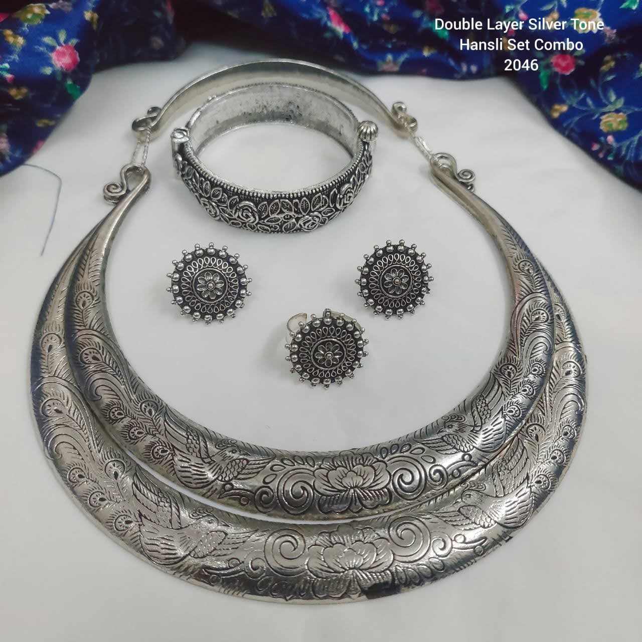 Make a statement with this unique and versatile Dual Layer Silver Tone Hasli Combo Set. The oxidized design features engraved floral design, adding a touch of good luck charm to your outfit. With premium quality earrings, ring, and bracelet, you can confidently express your style for any occasion. Affordable and stunning, this set is perfect for both western and ethnic wear.