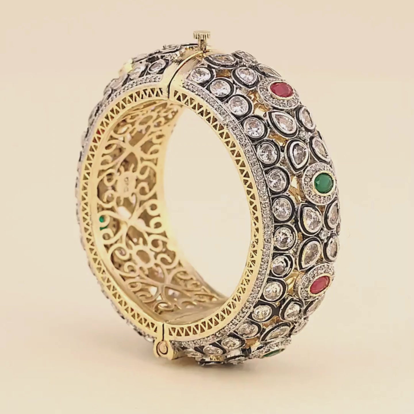 Elevate your holiday outfit with our versatile and elegant Stone Studded Bracelet! Made with premium quality stones, it adds a touch of shine for any occasion. Complete your festive look with this stylish bracelet that will surely make a statement. Perfect for any occasion, order now for a truly elevated look! These kadas are free size and suitable for both 2.4 and 2.6 bangle size, openable with a screw.