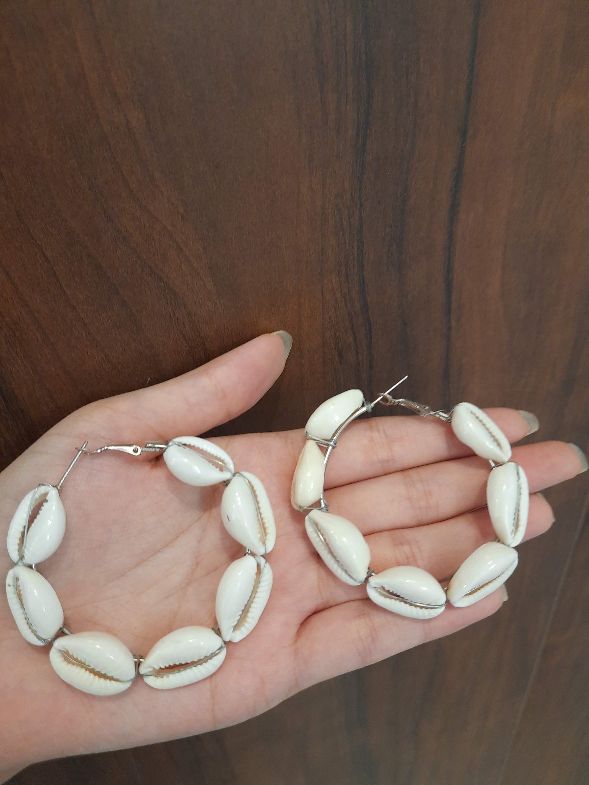 Silver plated circular hoop has white shell detailing and secured with lever back closure